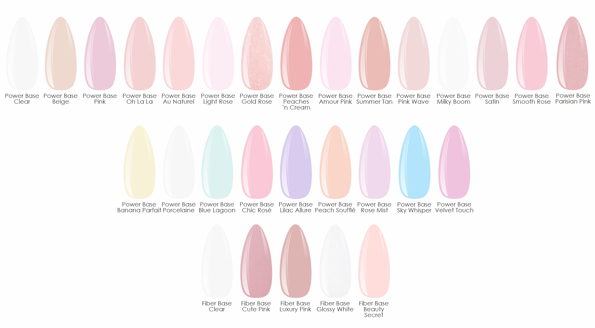 Clear, Beige, Pink, Oh la la, Au Naturel, Light Rose, Gold Rose, Peaches'n cream, Amour Pink, Summer Tan, Pink Wave, Milky Boom, Satin, Smooth Rose, Parisian Pink