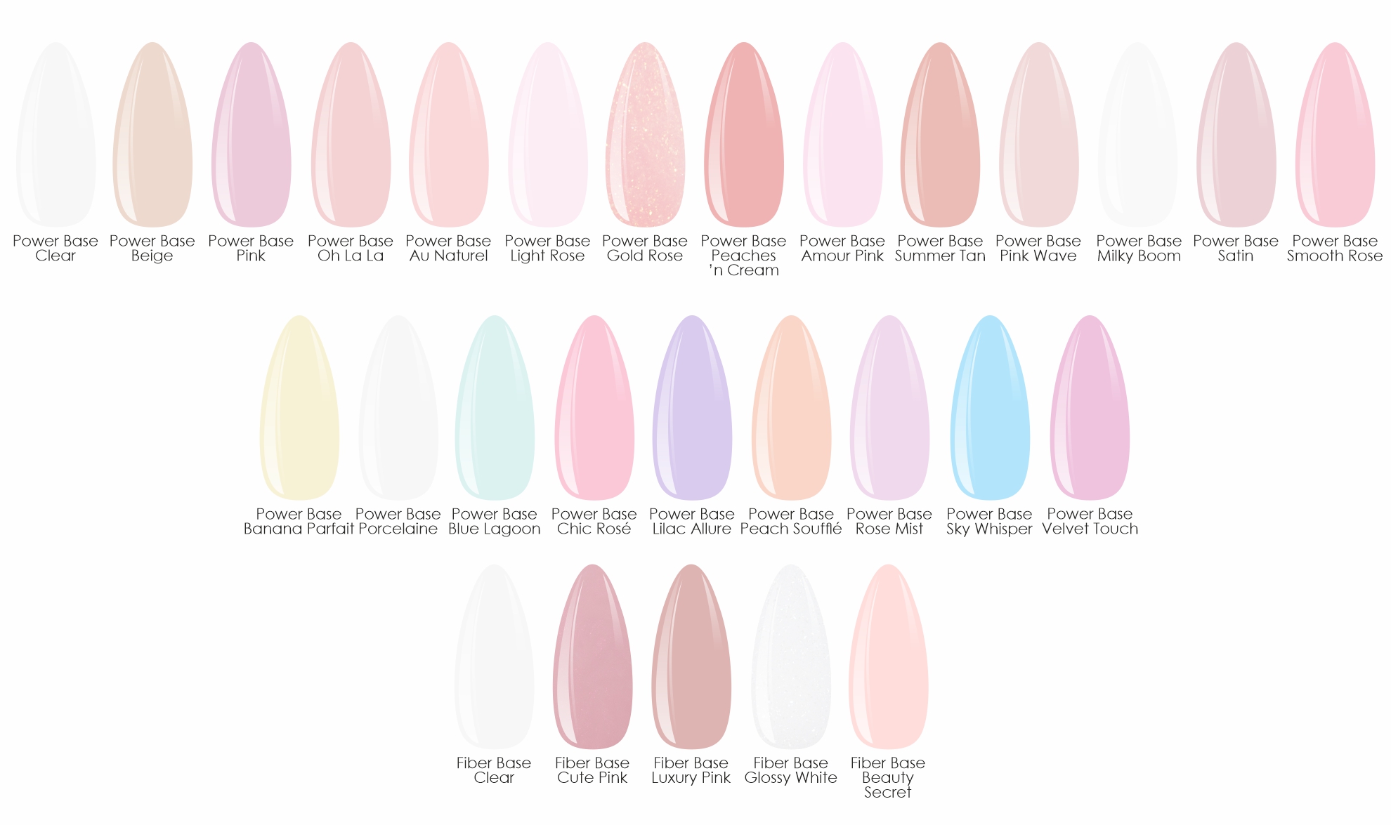 Clear, Beige, Pink, Oh la la, Au Naturel. Light Rose, Gold Rose, Peaches'n cream, Amour Pink, Summer Tan, Pink Wave, Milky Boom, Satin, Smooth Rose