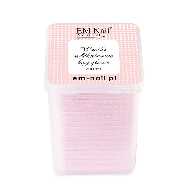 - Różowe bezpyłowe waciki z włókniny w kształcie eleganckiego kwadratu – 200 sztuk w praktycznym pojemniku. Idealne do manicure hybrydowego, żelowego i pracy z cleanerem. Styl i jakość EM Nail!